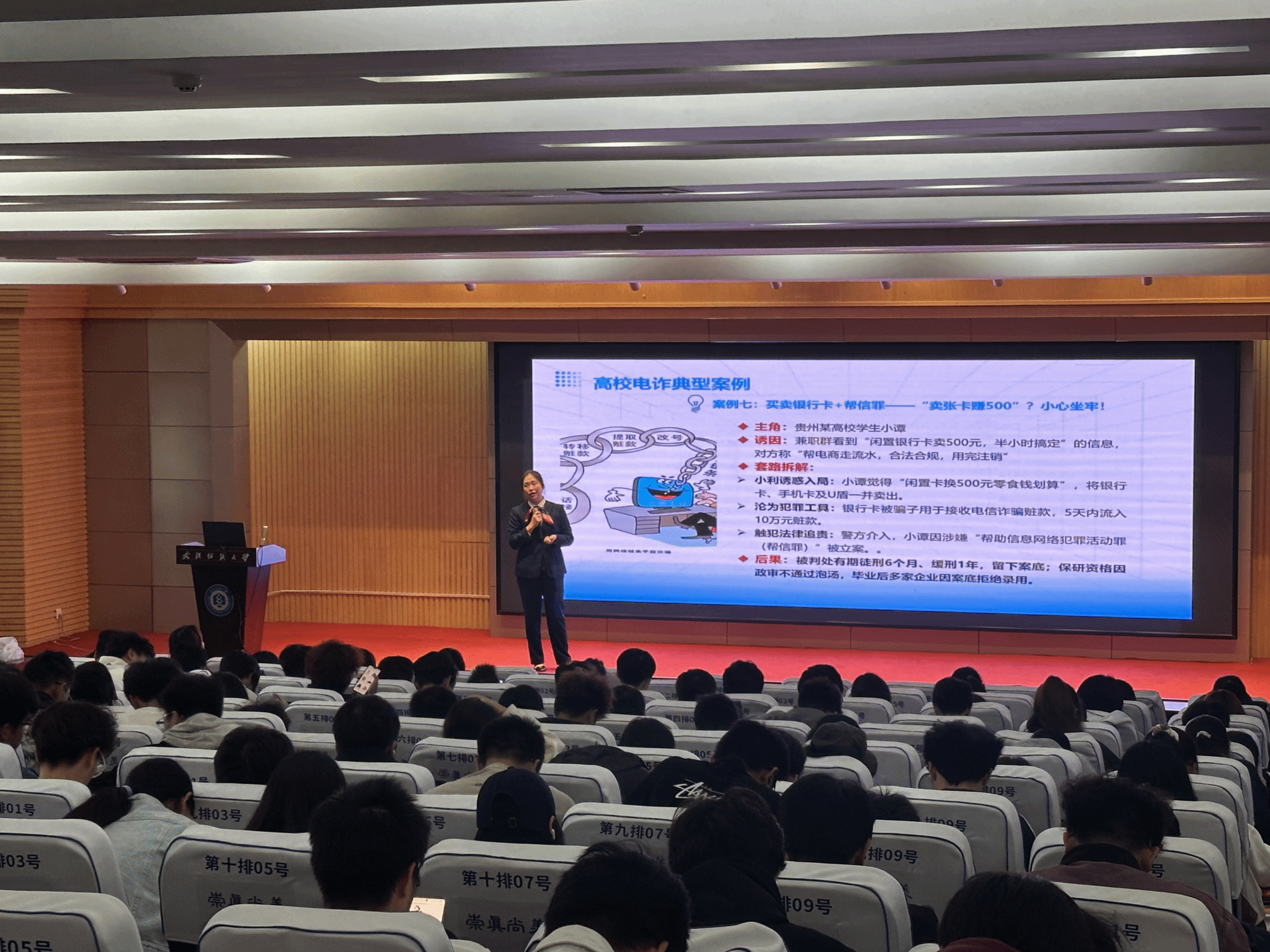 讲座现场,主讲人结合近年来高校诈骗典型案例,深入拆解了十大新生易中招的诈骗陷阱。从“刷单返利”的小额利诱、“游戏装备交易”的钓鱼链接,到“冒充客服”的精准信息诈骗、“冒充公检法”的权威施压,再到“非法校园贷”的利息滚雪球、“微信群冒充老师”的缴费诈骗等,每一起案例都直击新生日常学习生活场景。