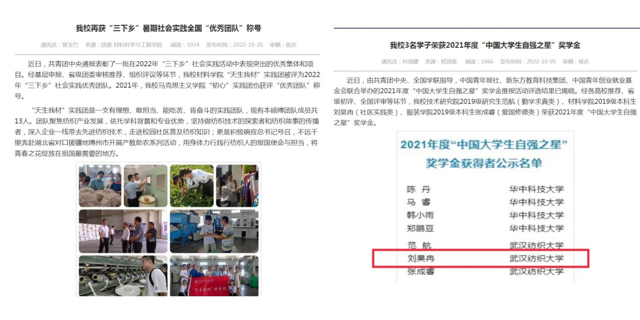 学院“天生我材”实践团荣获团中央2022年全国“三下乡”社会实践活动“优秀团队”称号。高分子11902班刘昊冉荣获2021年度“中国大学生自强之星”。