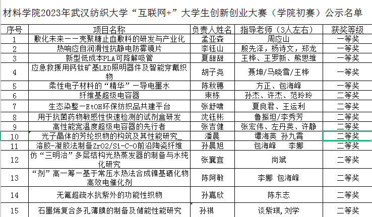 经学生自主申报、学院审核、组织答辩评审等环节,现将2023年“互联网+”大学生创新创业大赛学院初赛现予以公示,(见附件), 获一等奖的项目推荐到学校参加重点项目训练营,公示时间:2023年3月3-5日, 如对结果有异议,请在公示期内向学院反映。联系电话:59367580