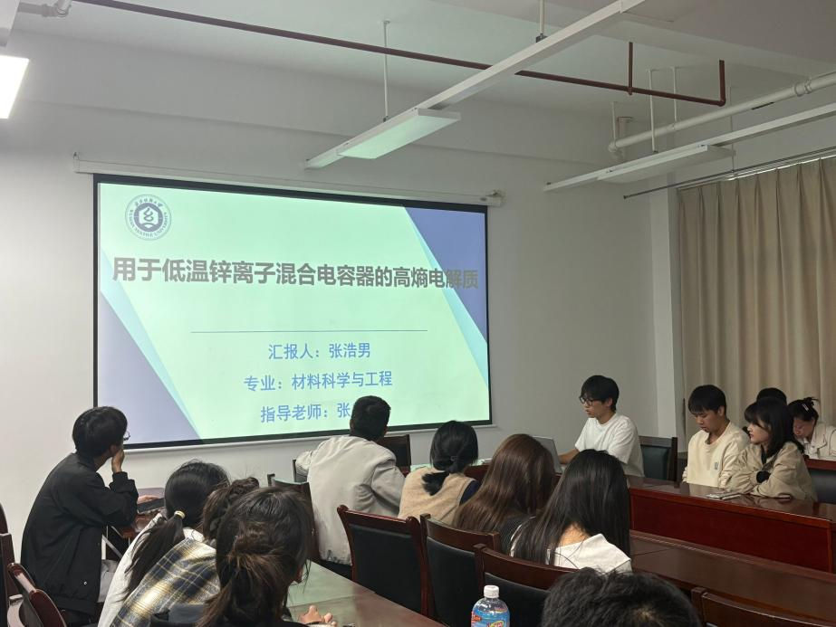 张浩男同学以《用于低温锌离子混合电容器的高熵电解质》为题,针对水性锌离子储能低温性能衰减难题,创新提出“高熵电解液(HEE)”设计策略。通过ΔG = ΔH – TΔS热力学调控,在5元锌盐(Zn(BF₄)₂、Zn(Ac)₂、Zn(NO₃)₂、ZnCl₂、ZnSO₄)或5元溶剂(H₂O-DMSO-DMAc-NMP-EG)体系中引入高混合熵,成功将电解液凝固点降至-78 °C,-20 °C离子电导率仍达6.8 mS cm⁻¹。对称Zn//Zn电池在0.5 mA cm⁻²下稳定循环1200 h,ZIHC器件-20 °C能量密度保持常温的86%。该成果为极端气候条件下可再生能源储能系统提供了高安全、耐低温的核心电解质方案。