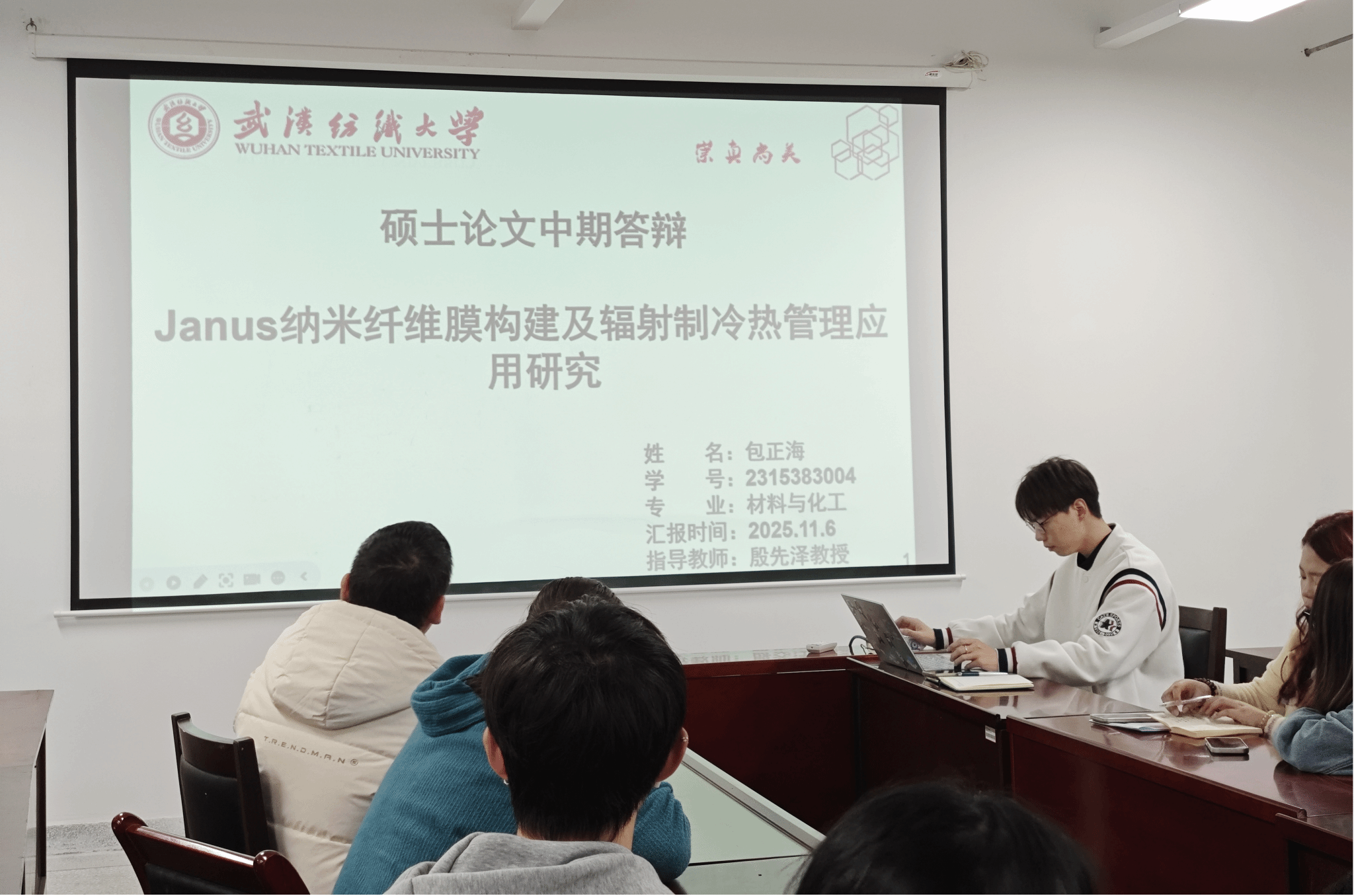 包正海同学以《Janus纳米纤维膜构建及辐射制冷热管理应用研究》为题,针对传统制冷技术能耗高、污染大的问题,提出了一种仿生结构的PCCA(PVDF-HFP/CA/Al₂O₃/CSfs)复合织物。该织物通过静电纺丝技术构建具有辐射冷却与单向导湿功能的Janus结构,实现了在无需外部能源输入情况下的高效降温,日间降温达约8°C,同时具备优异的可穿戴性与传感性能,在智能纺织品与个人热管理领域展现出广泛应用潜力。