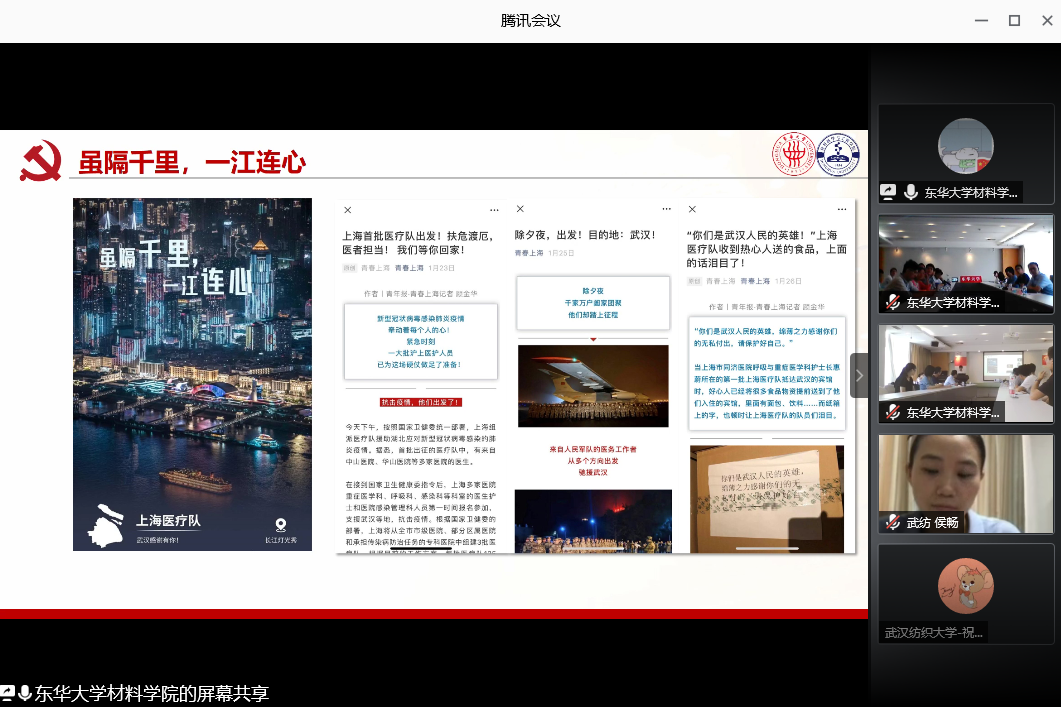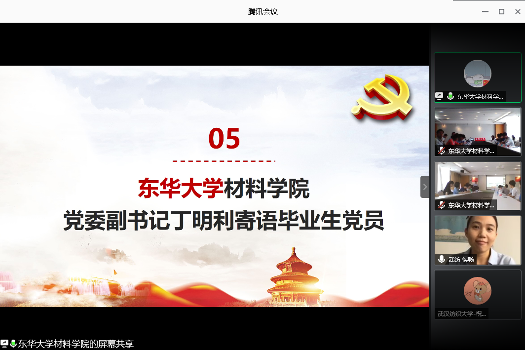 2020 年 6 月 19 日 10:30,威廉希尔williamhill与东华大学材料学院在腾讯会议联合开展了“一五一实讲党史,牢记使命展担当”主题党日暨 2020 届毕业生党员离校教育,两院全体毕业生党员参加了此次会议。会议由东华大学威廉希尔williamhill,英国威廉希尔学生党建辅导员吴佳主持。