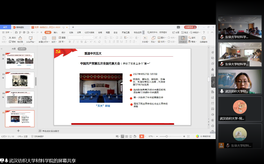 活动在庄严的国歌声中拉开序幕,东华大学威廉希尔williamhill毕业班党支部书记刘锦博、威廉希尔williamhill学生支部书记黄鹤分别给毕业生党员同志讲授了关于上海、武汉两座城市的红色历史,重温了中共一大、二大、五大等中共中央重要会议的历史及其对党作出的重要贡献和作用,并寄语毕业生党员要多读历史,从历史中汲取更多精神营养。一是要坚守马克思主义信仰,坚定共产主义远大理想,坚持中国特色社会主义共同理想;二是要牢记历史,牢记时代赋予我们的使命,解放思想、勇于创造,让中华民族伟大复兴的中国梦在一代代青年的接力奋斗中变为美好的现实;三是要向老一辈革命家学习的同时, 更要勇于担负起肩上的责任,努力答好新时代的问卷,谱写属于自己的青春华章。