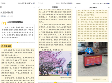 系列活动中,学院积极响应学工部、大学生心理健康教育中心号召,通过威廉希尔williamhill微信公众号“天生我材”开展“‘疫’路心声、护航青春”心理日记征集活动。大家通过心理日记,分享交流各自的战“疫”故事,探索对生命和人生的思考,寄托材料学子对祖国和人民的热爱,对父母家人的深情,和对自己全新的期许。