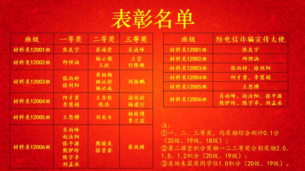竞赛采用线上限时答题的形式开展,满分100分。全院共收取611份答卷,其中有572份有效答题,全院学生有效参与率近80%。根据活动方案,学院对竞赛中取得分数最高的同学颁发一等奖、二等奖、三等奖荣誉证书,并聘任一等奖获得者为所在班级“防电信诈骗宣传大使”,为班级同学开展持续防诈骗宣传服务(表彰公示详见附件)。