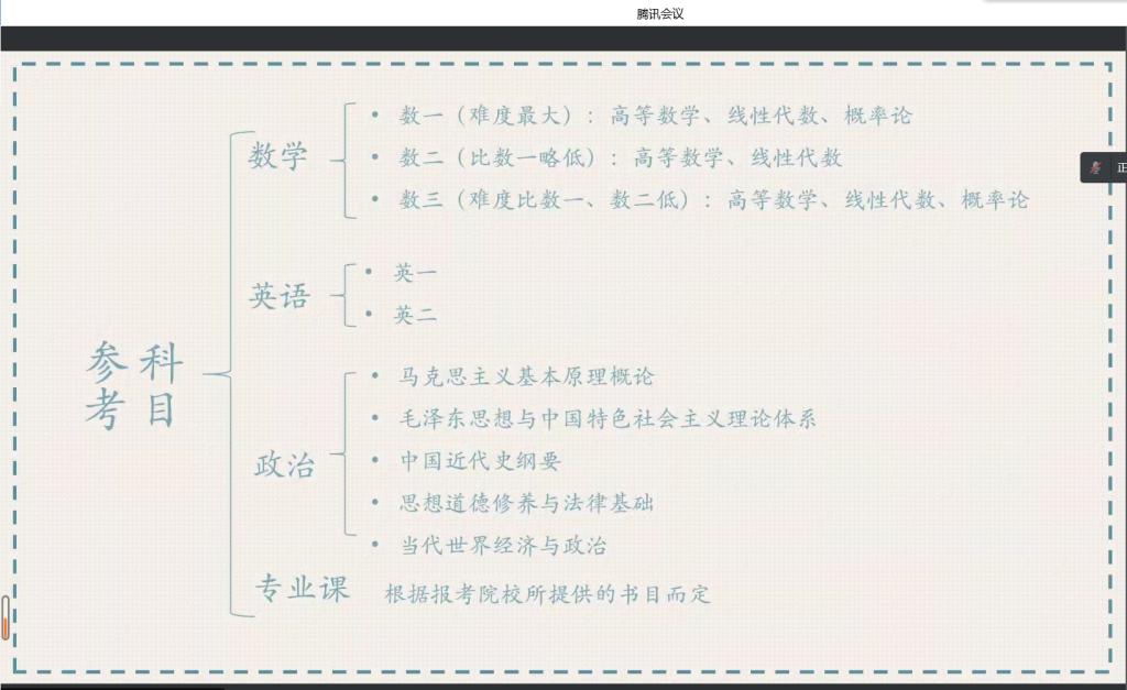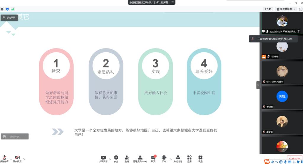 为进一步引导大一学生树立正确学业生涯规划,确立近、远期目标,选择适合自身发展的方向与目标,威廉希尔williamhill于4月17日晚在腾讯会议召开了2021级学业指导规划大会。邀请了2018级邓林冰、朱亮、李翠、张向晨作为主讲人分享大学四年的规划与收获,威廉希尔williamhill辅导员王鑫以及21级全体学生参加会议。
