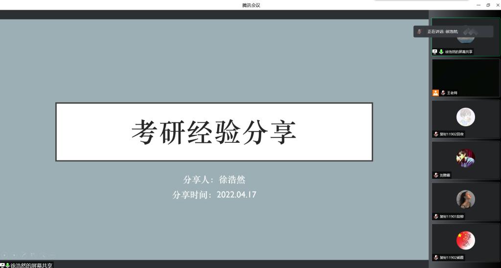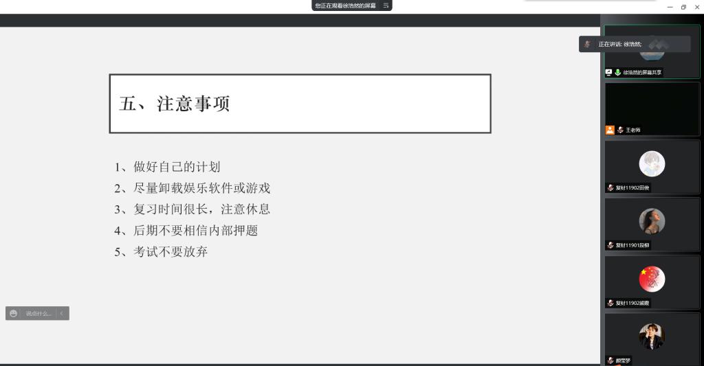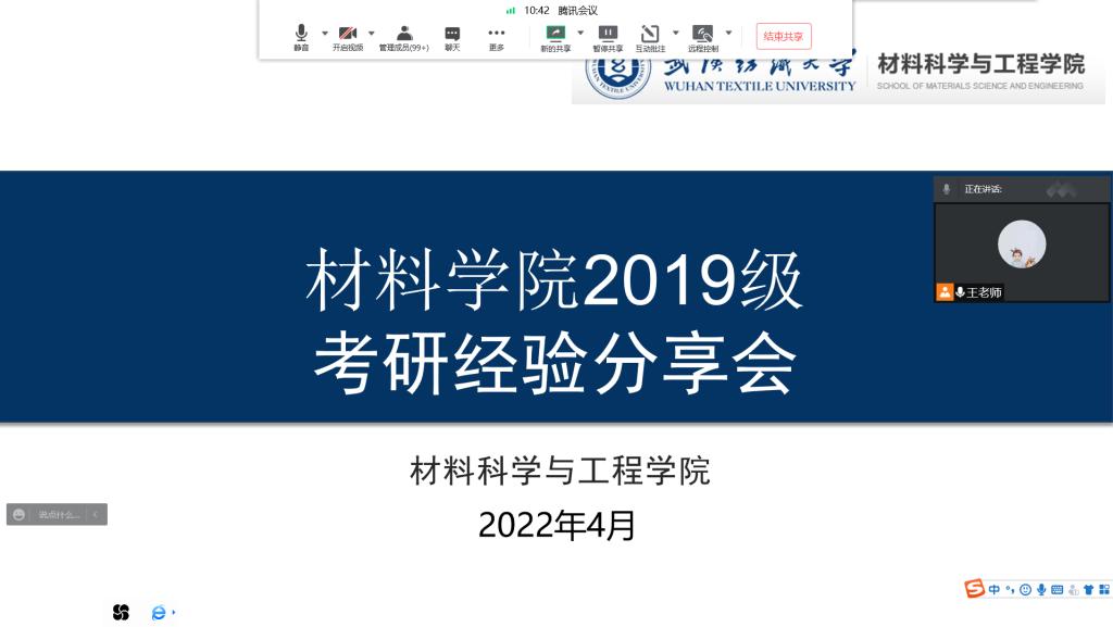 威廉希尔williamhill2018级考研录取率突破48%,为进一步做好2019级学生考研指导,4月17日下午,在腾讯会议举办了威廉希尔williamhill第二场考研经验分享会。邀请了2018级学生刘雅霜(376分考取武汉大学材料专业)、徐浩然(407分录取武汉理工大学材料专业)、颜梦莹(357分录取南京邮电大学材料专业)、余英杰(389分录取威廉希尔williamhill材料专业)主讲来分享考研经验,威廉希尔williamhill辅导员王鑫以及19级全体学生参加会议。
